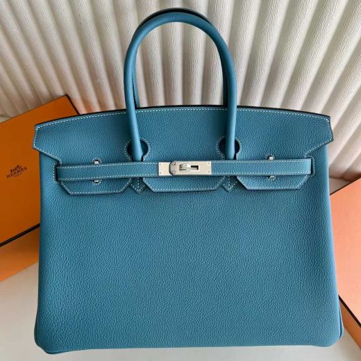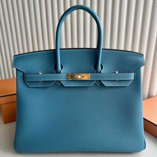 Bag:Â Birkin (35cm ) Stamp:Â U (2025) Color: New Denim Blue Material:Â Togo Leather Hardware:Â Brushed Gold Measurements:Â 35cm Condition:Â Store Fresh Details:Â This bag is Store-Fresh. It has never been carried and includes all of the original accessories. Accessories:Â Raincoat; protective felt; dust bag; clochette; lock & keys Includes:Â Box, Receipt, Care Card